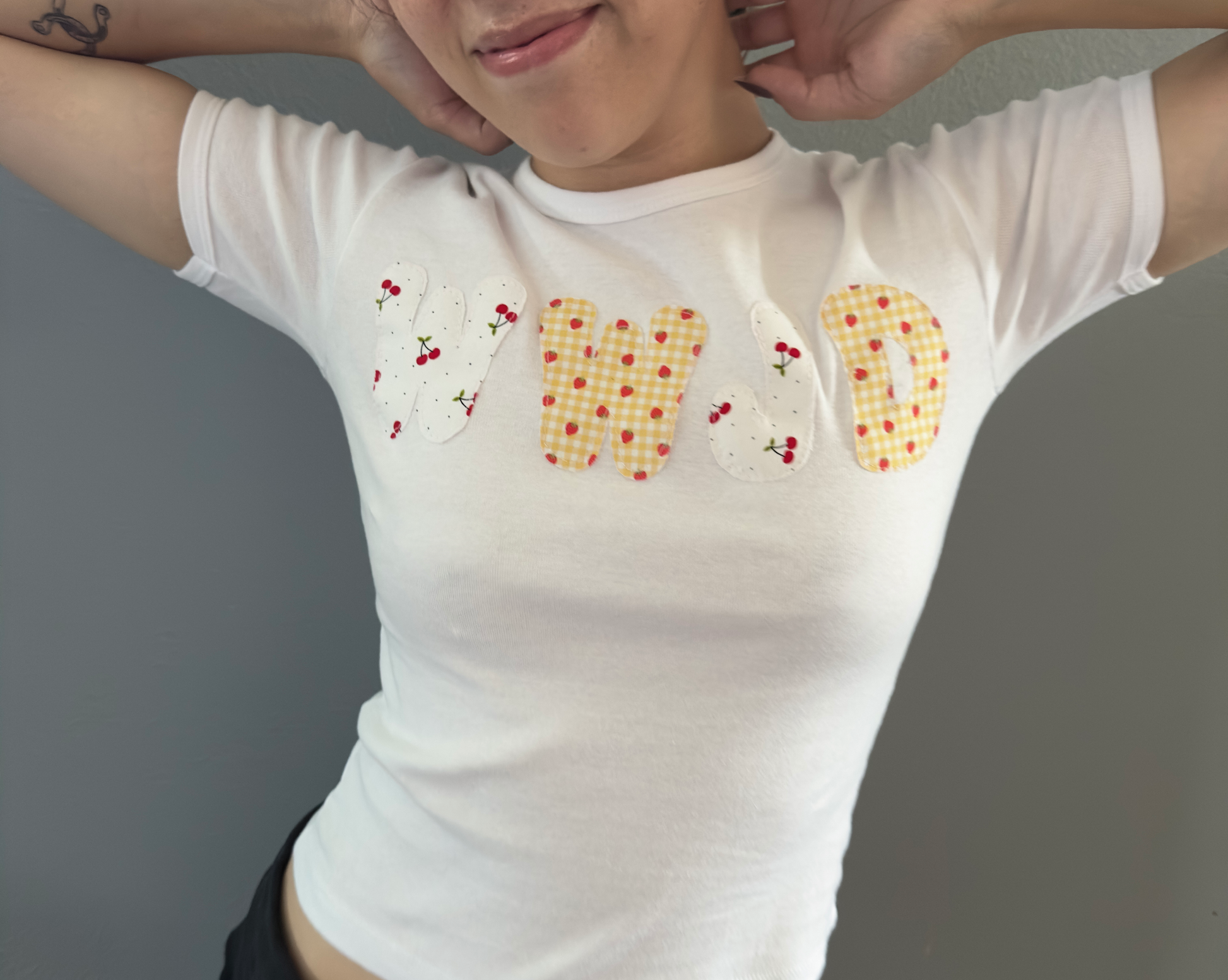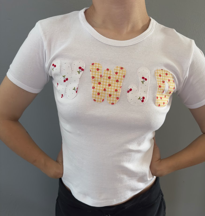 We started with an LA Apparel 1x1 Baby Rib baby tee in a size small — soft, stretchy, and made from 100% US-grown cotton. Then we hand-cut the “WWJD” lettering and stitched it on.